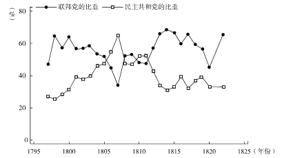 图3:1797~1822年马萨诸塞州参议院联邦党和民主共和党议员的比例
