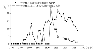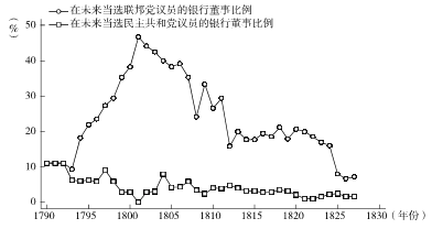 图1: 1790-1827年波士顿的银行董事中在成为银行董事或行长前曾经担任联邦党和民主共和党议员的比例