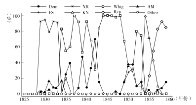 注:Dem指民主党,NR指国家共和党,Whig指辉格党,AM指美国党,FS 指自由土地党,KN指无知党,Rep指共和党,Other指其他政党,图6同。